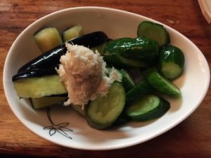 きゅうりとなすの一夜漬です。これも「やまわさび」をつけて食べます。 なんともいえない美味しさです。