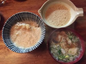 最後の締めはとろろめし。とろろは少し粘り不足でした。 しゃけの入った特製ママのご自慢のお味噌汁です。