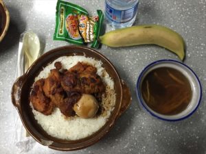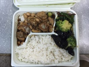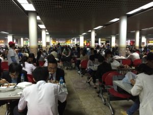 はるか見渡す限りのとっても広い食事をする会場で、昼食をとります。中ではマクドナルド、ピザ、お弁当、麺など沢山のお店がいっぱいです。有名なレストランの出店だと思いますが、写真の弁当は25元、約500円です。しかし日本人の私の口にはなかなか合いません。毎回弁当は半分食べればいいほうでした。