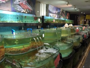 魚屋さんの店頭で購入した魚をレストランに持ち込んで料理してもらえるみたいです。 呼び込みが怖かったので、逃げるように奥に進み一番奥のお店に逃げ込みました。