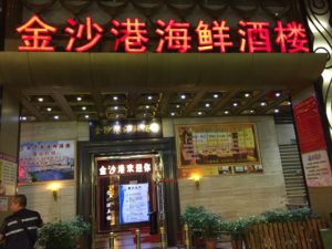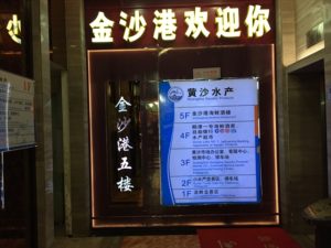 そのお店が 金沙港海鮮酒楼 の名のレストランです。ビルの5階です。 人気店のようで現地の方でいっぱいでエレベーターに乗るのも大変でした。