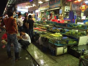 黄沙水産公易市場のゲートをくぐると、道の両側にぎっしりといわゆる魚屋さんとレストランが並んでいます。魚屋さんのお兄さんの呼び込みがすごいです! 「こわい」の一言です。レストランの呼び込みもすごいです!