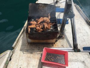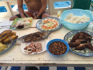 一日3本のダイビングコースは、午前中に2本潜り、午後に1本ダイビングをします。午前のダイビングの後にボートの上でクルーが魚や、鶏肉を焼いてランチをつくってくれます。お肉、魚、貝、野菜となかなかバランスのとてたランチです。いつも美味しくいただきました。ただ私はフィリピンのお米が苦手ですので日本から4種類の「ふりかけ」を持参してご飯にかけて食べていました。