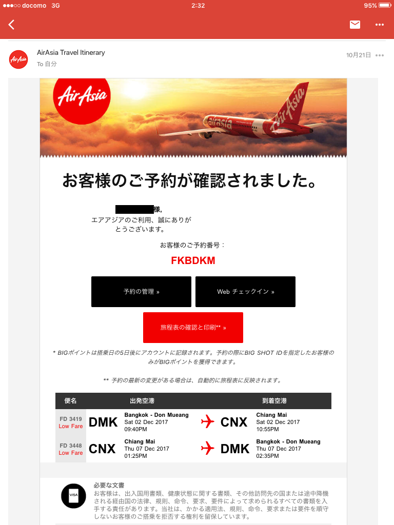 バンコクのドンムアン空港~チェンマイ空港まではエアーアジアにてチケットを購入しました。預入荷物15キロ、座席指定あり、食事なしで12,510円でした。