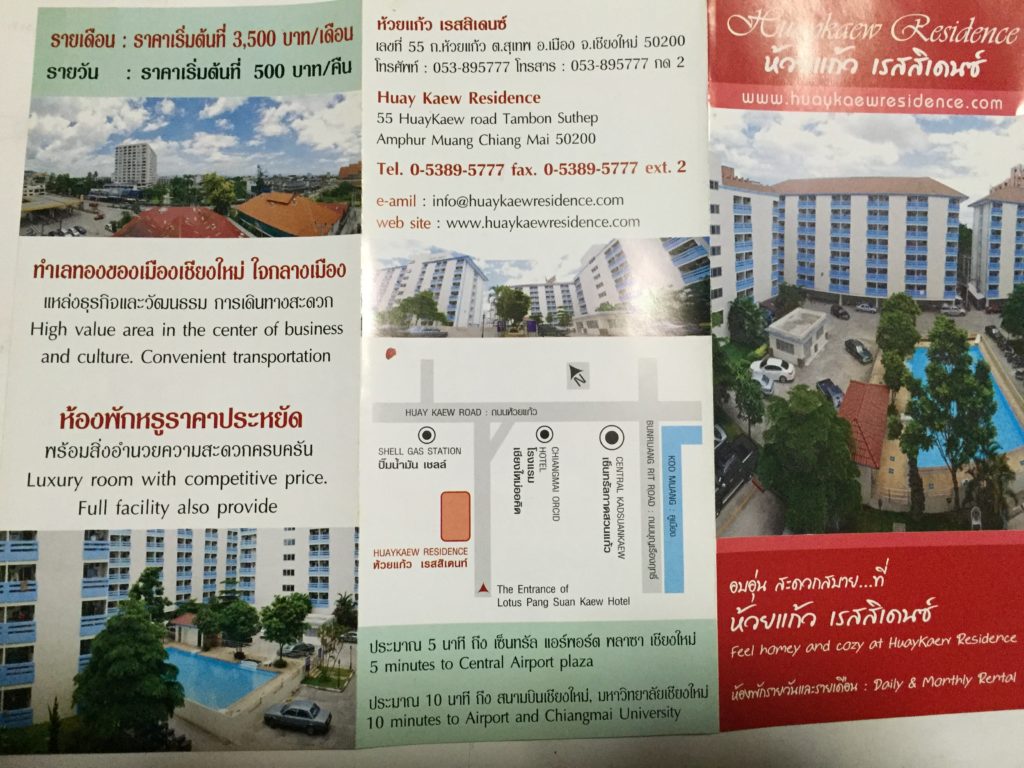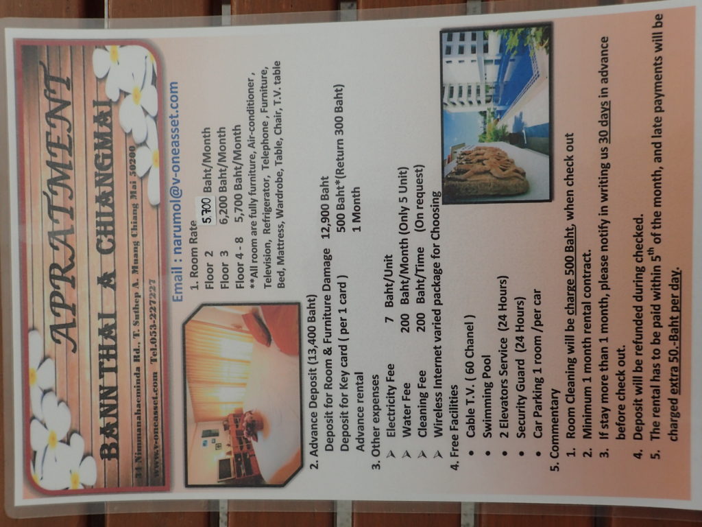 あいにく私の希望するスタジオタイプの5000~5500バーツの部屋は満室とのことで、部屋をみせていただけませんでした。「Next year OK」と尋ねますと「NO」といわれました。かなり人気があるみたいでなかなか空室がでないみたいです。建物は少し古びた感じの建物でした。この地区は日本人のロングステイヤーがかなりお見えになるみたいなことを聞きました。私としては中心地より少しなはれていますので先に見学したコンドニアムの方がいいかなと思いました。