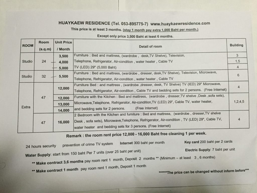 このコンドニアムも玄関を入りますと事務所があります。事務所の窓口で「Halo Please show me rent room」と言えばここの先方もなれたものです。下のプライス表をすぐに見せてくれます。