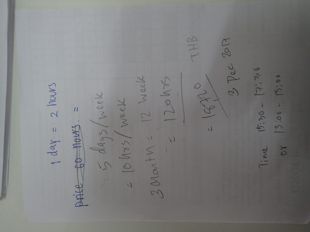 この英会話教室は一日2時間で5~7名のグループレッスンです。中国、韓国の方が多いと言っていました。一日2時間で一週間、5日間で10レッスン 3か月12週120時間で18720バーツ(日本円で62000円)と説明していました。今日、申し込んで支払いをすると5%程値引きするとも言っていました。