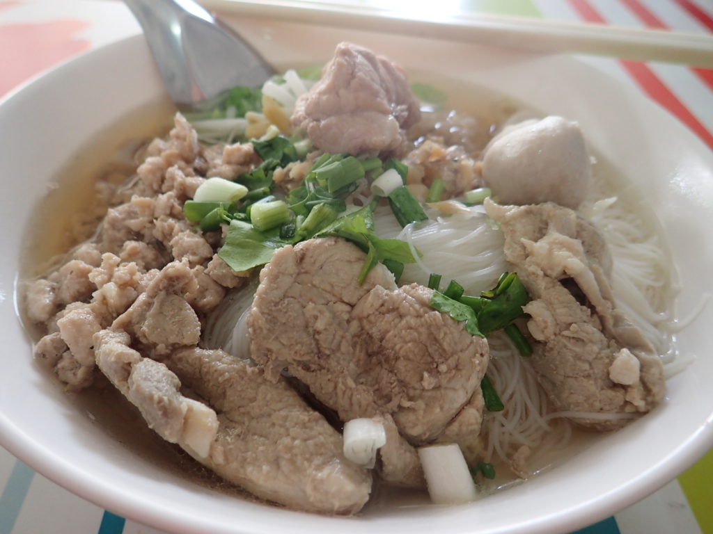 タイの代表的な麺、米粉のラーメンです。自分でお砂糖、ナンプラー、お酢、唐がらしを加えて味付けをします。どこのお店でも麺の写真付きのメニューを出してくれますので、指さし注文OKです。40バーツ(日本円で140円)