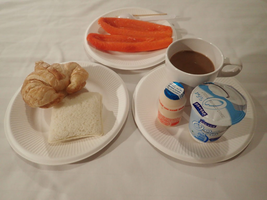 ホテルに朝食がついておりませんでしたので、街中にいっぱいありますコンビニ セブンイレブンにて前日に買い求めた朝食です。内容はクロワッサン、サンドイッチ、ヤクルト、ヨーグルトこれで35バーツ、屋台で20バーツで購入したマンゴ-の半分10バーツ、コーヒー無料、本日の朝食しめて45バーツ(日本円で150円)