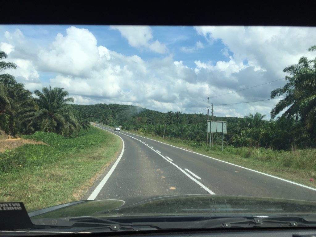 タワウ空港からホテルのあるセントポルナまではホテルに送迎を依頼して、ヤシの木が両側に植えられた道を片道約1時間半かけて進みます。 料金はチャーター便で3000円でした(3人で一人1,000円 往復2,000円)